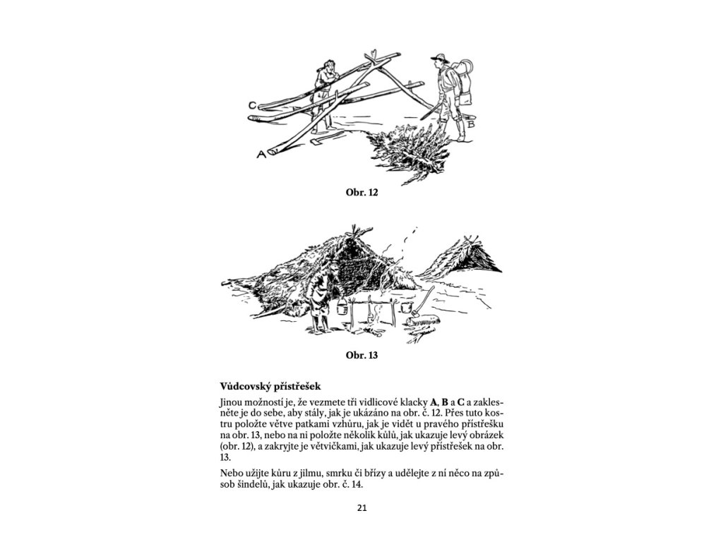 Text je doplněn nepřeberným množstvím autorových ilustrací, které krok za krokem ukazují techniky stavby. Dílo není jen návodem k přežití v divočině, ale také odrazem dobového étosu – návratu k přírodě a soběstačnosti v dobrodružném duchu skautingu, který v té době, ač v samých počátcích, zažíval největší rozkvět.